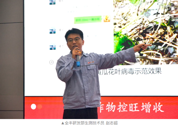 全丰研发部生测技术员赵志超针对辣椒种植中令人头疼的病毒病问题,进行了详细的病理特性讲解。他从病毒病的传播途径、发病症状等方面入手,让大家对这一病害有了全面的了解。同时,重点介绍了氟苄硫缩诱醚在病毒病防治上的应用效果。通过实际案例和科学数据,展示了该产品在防治病毒病方面的卓越性能,为种植户们提供了一把科技护航的利器。